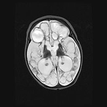 Кистозная энцефаломаляция головного мозга - одна из форм поражения головного мозга в детском возрасте. Характеризуется возникновением множественных и распространённых кист в коре, белом веществе и подкорковых образованиях головного мозга у плодов, новорождённых и детей раннего возраста. Развитие кистозной энцефаломаляции связано с внутриутробной асфиксией и гипотонией, родовой травмой, тромбозом синусов, пороками развития сосудов, инфекциями, сепсисом и другими причинами. Наиболее значимые инфекционные агенты: вирусы простого герпеса, цитомегалии, краснухи, токсоплазмы, энтеробактерии, золотистый стафилококк и другие.