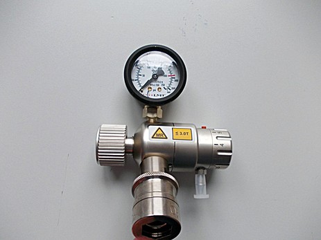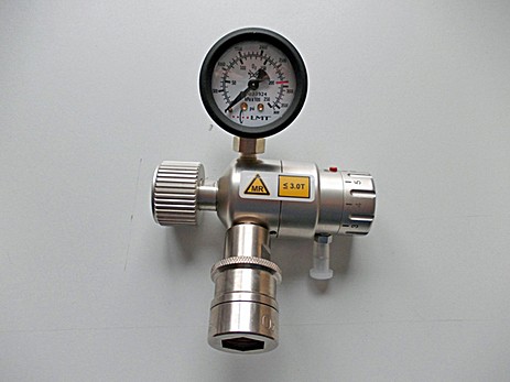 Может использоваться без какого-либо риска в магнитно-резонансной среде. Присоединяется к магнитносовместимым воздушным или кислородным баллонам объемом 5л. Регулятор обеспечивает непрерывную регулировку поставки газа как во время транспортировки больных, так и в помещении МР томографии во время проведения МРТ детям. Используется как с воздушными, так и с кислородными баллонами, и имеет стандартные входные и выходные отверстия для подсоединения.
